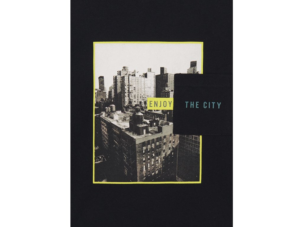 Chlapecké triko s dlouhým rukávem a potiskem města na přední straně.