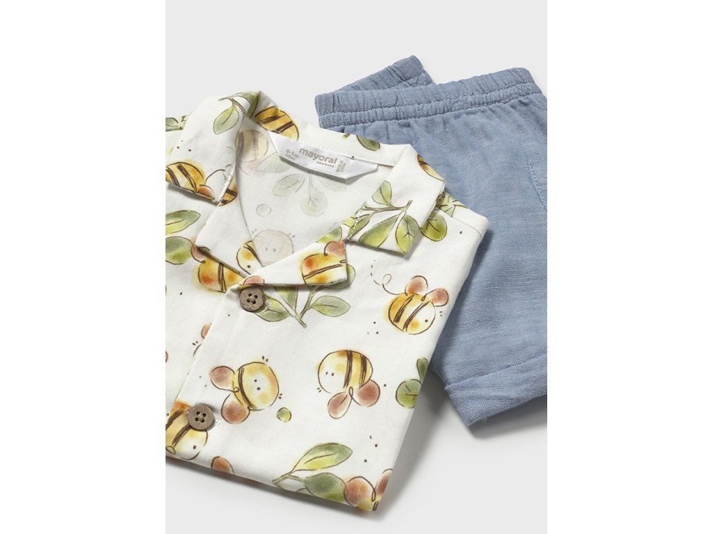 Chlapecký letní 3 dílný set s košilí s krátkým rukávem a potiskem včel, mušelínovými kraťasy a trikem s krátkým rukávem.
