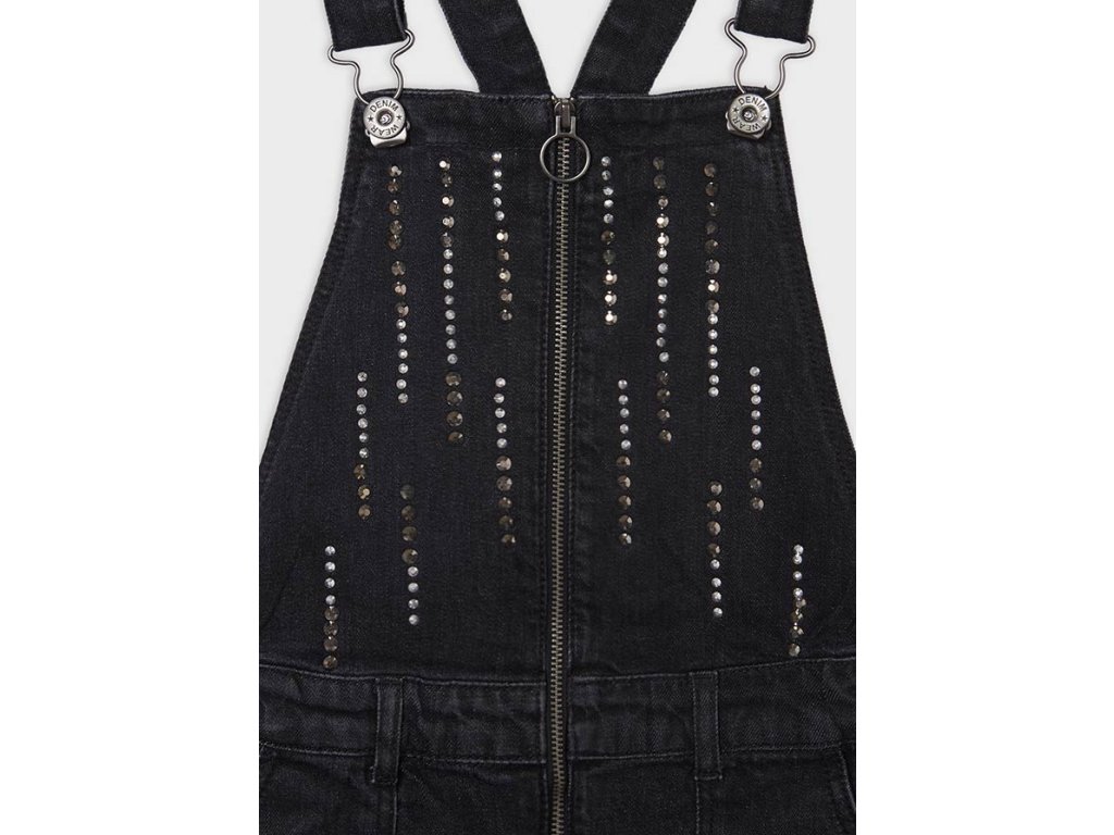 Dívčí džínová sukně s laclem, ozdobená druky a zipem.