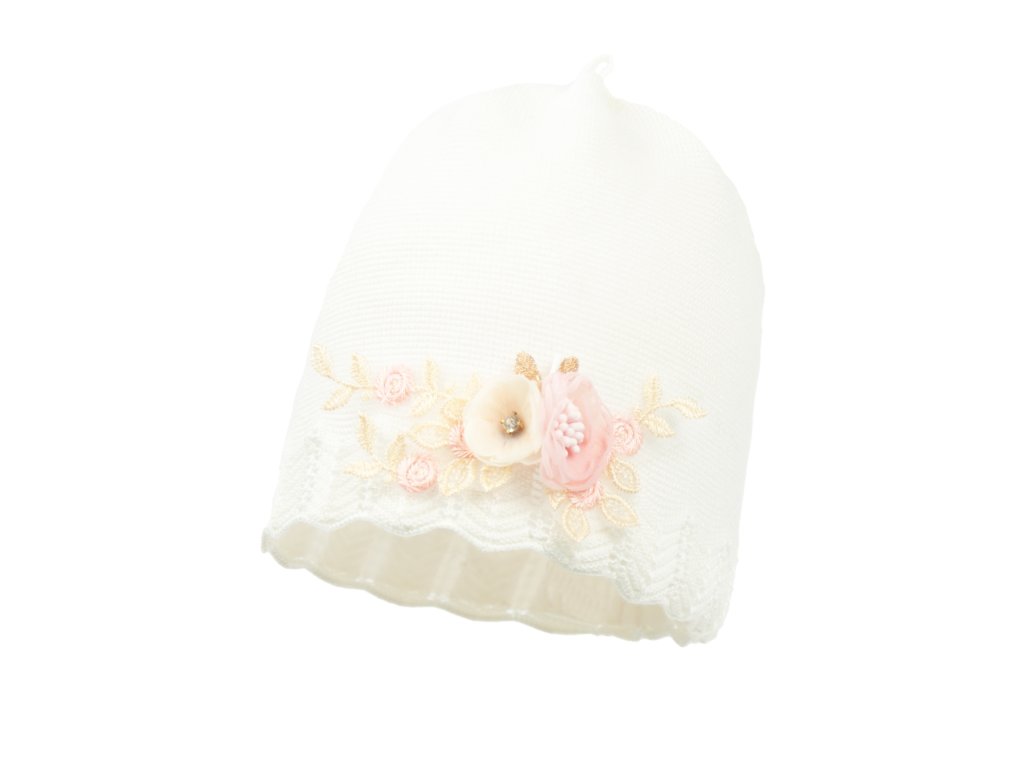 Dívčí jarní úpletová čepice ozdobená květinou.
