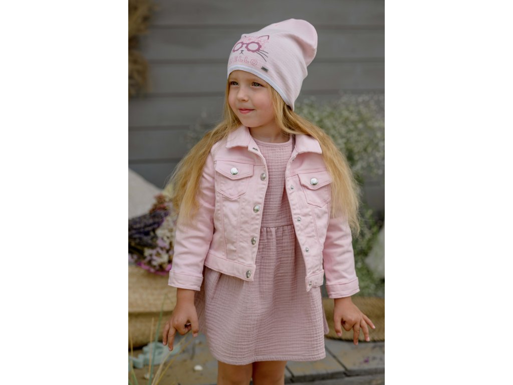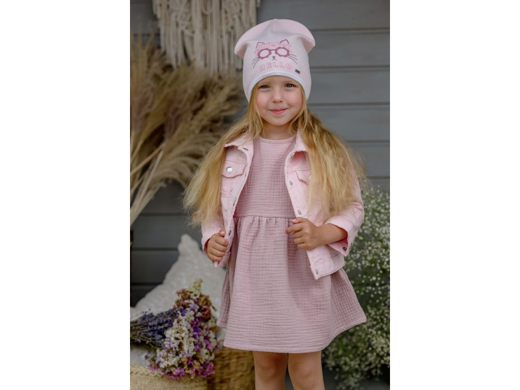 Dívčí jarní lehká úpletová čepice s potiskem kočky.