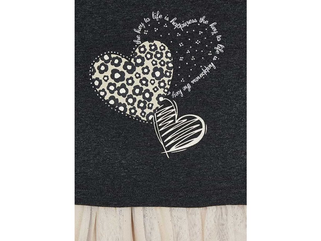 Dívčí šaty na ramínka s tylovou sukní se třpytky a podšívkou, doplněné krátkou mikinou s potiskem srdíček. Je možné nosit každou věc zvlášť.