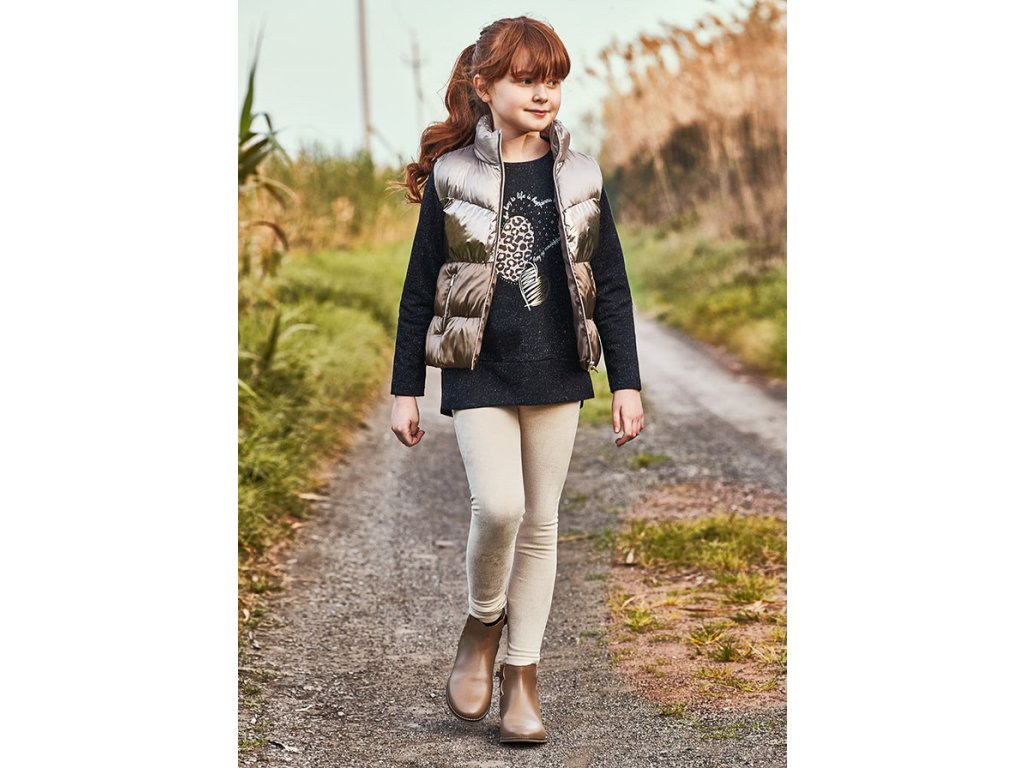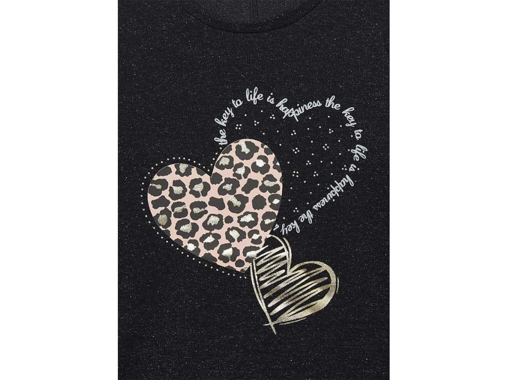 Dívčí set teplákové mikiny s potiskem srdce a prostřižením a propínáním na zádech s legíny, které jsou v provedení broušené umělé kůže.