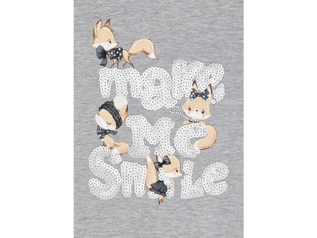 Dívčí set teplákové mikiny s potiskem lišek a flitrovým nápisem. Legíny jsou v pase do gumy.