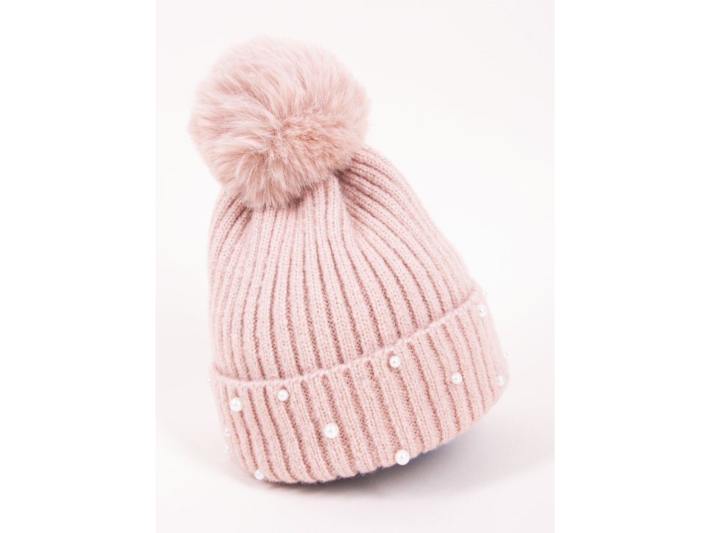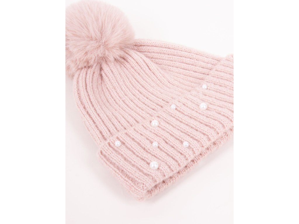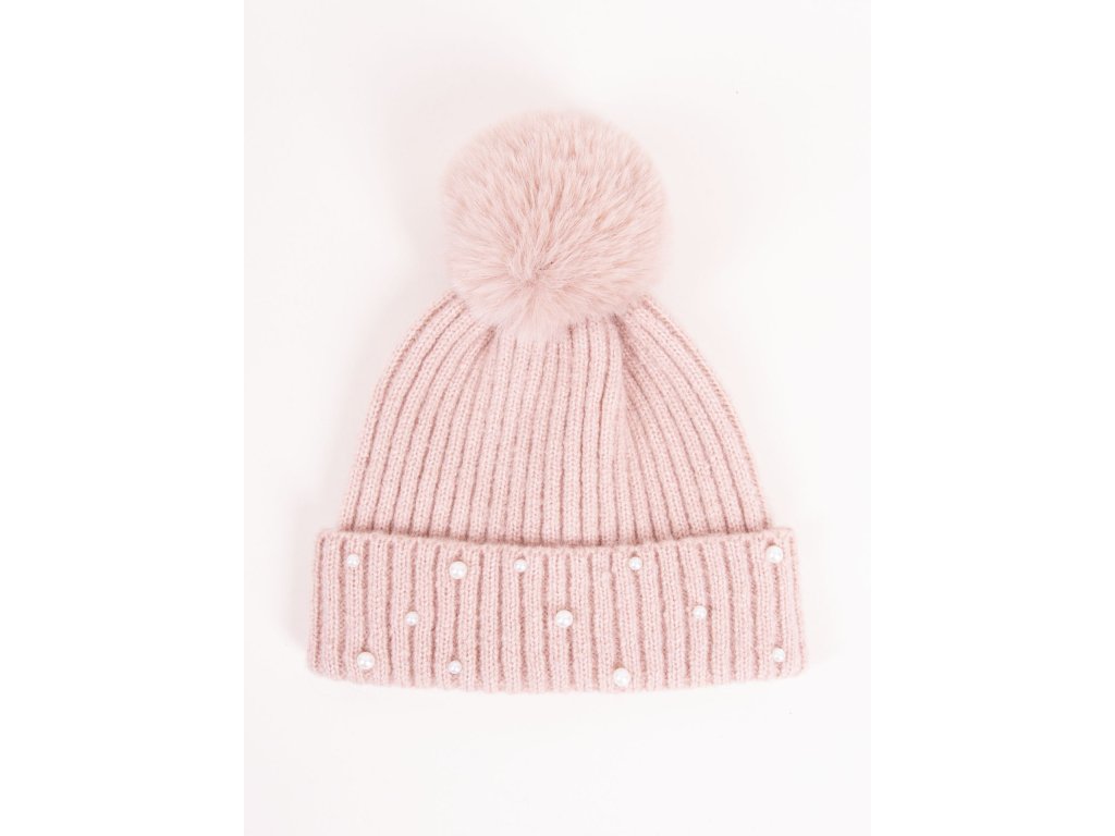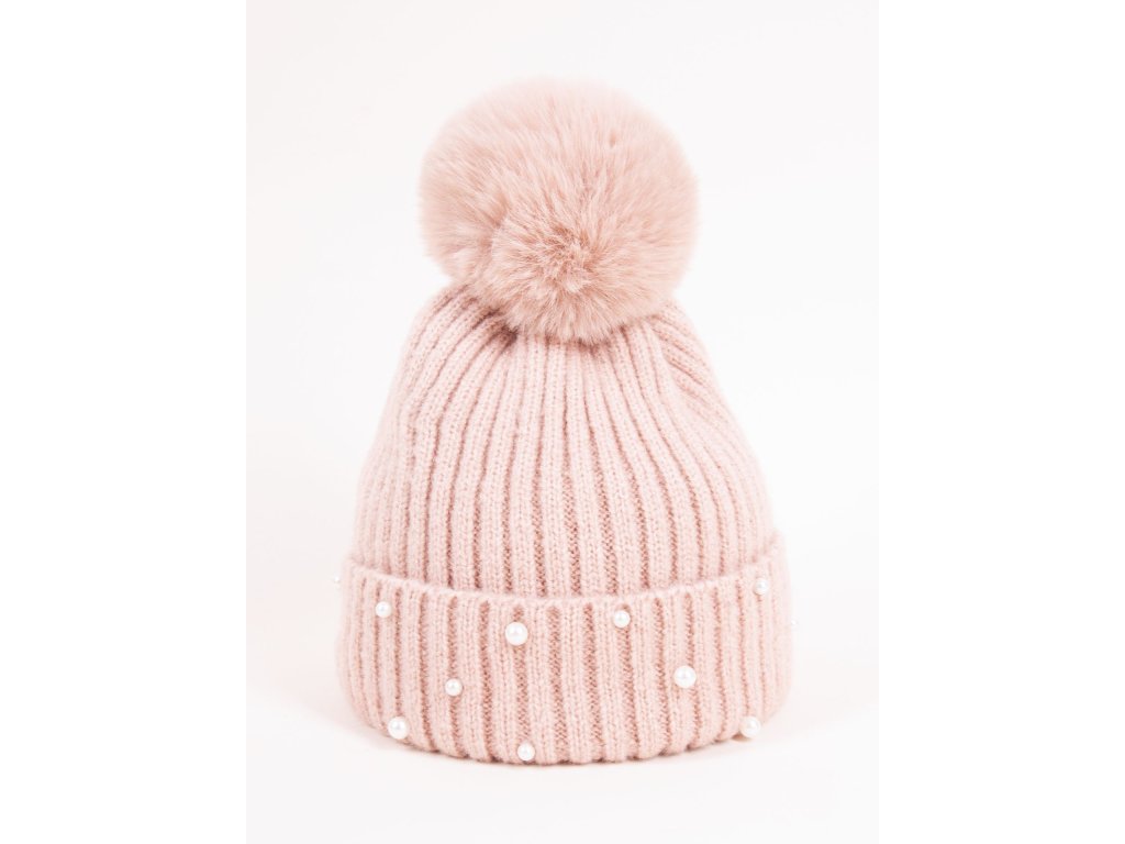 Dívčí zimní úpletová čepice ozdobená bambulí z umělé kožešiny a všitými perličkami. Čepice má bavlněnou podšívku. Barva je ve skutečnosti trochu tmavší pudrová růžová.