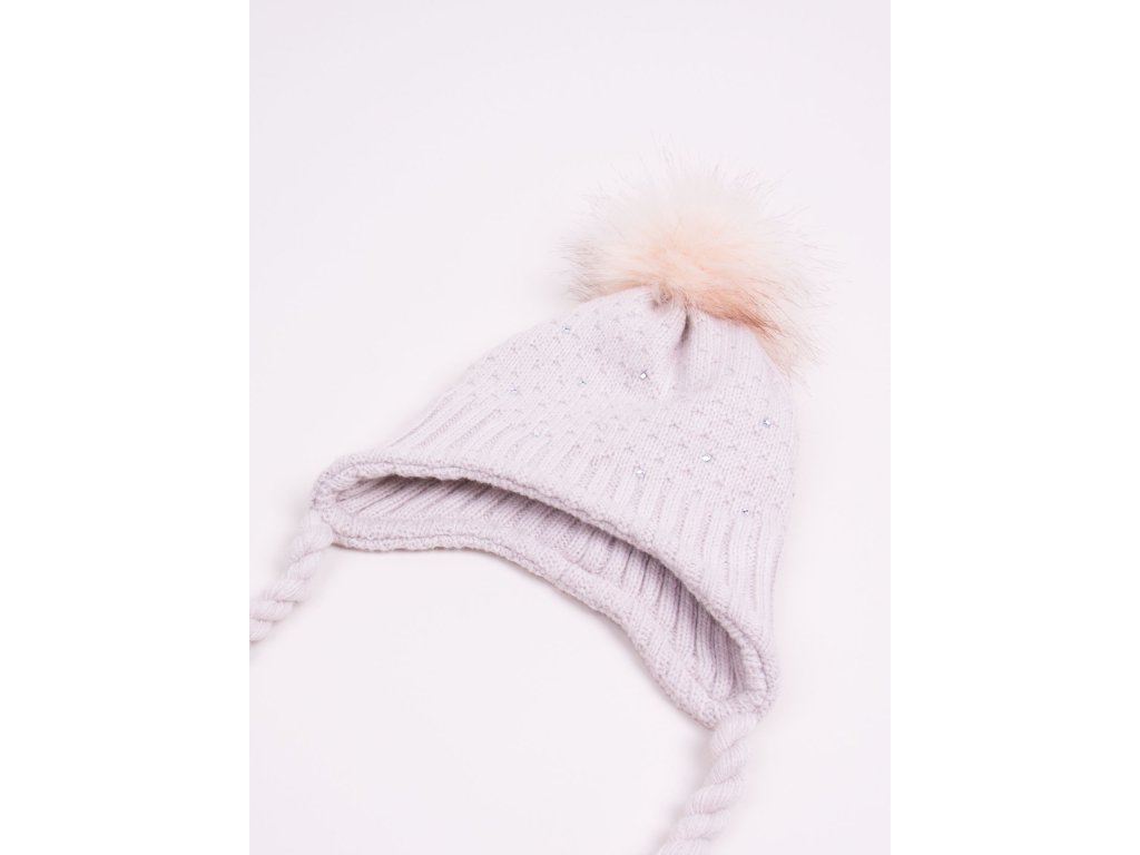 Dívčí úpletová zimní čepice s bambulí a všitými kamínky. Čepice má bavlněnou podšívku.